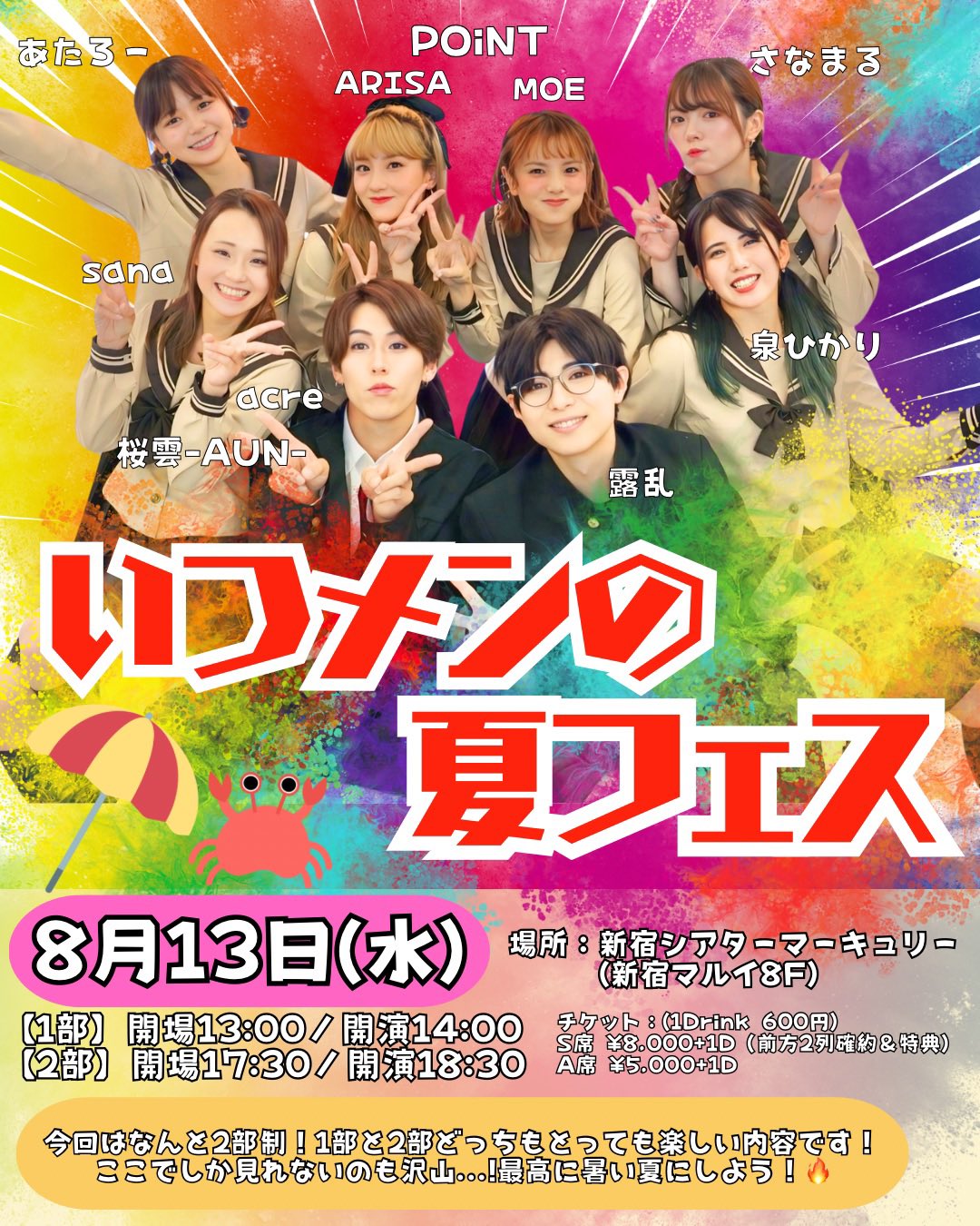 ファンイベント 2025年8月13日(水) ~ 2025年8月13日(水) いつメンの夏フェス 1部 チケット購入: t.livepocket.jp イベント詳細 日付: 2025年8月13日 14:00 カテゴリ: ファンイベント 公演概要 開演日時 8月13日(水) 開場13:00/開演14:00 チケット ・S席(前方2列確約・特典あり):8,000円 ・A席:5,000円 チケットはこちらにて販売。 ※ご入場の際は、別途で1ドリンク(600円)のお支払いが必要となります。 出演者 acre , sana , さなまる , あたろー , 泉ひかり , 露乱 , ARISA , MOE 主催 合同会社Realiser お問い合わせ 公演に関するお問い合わせはこちらにお願いいたします。