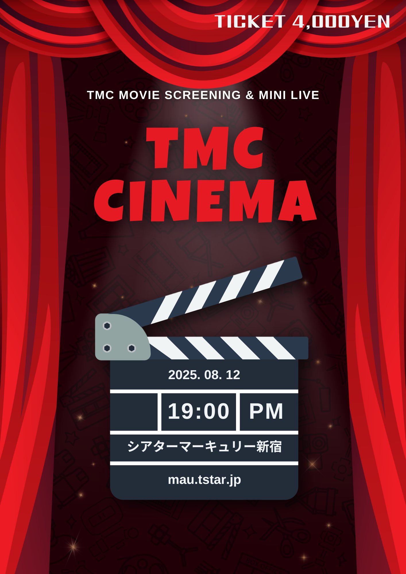 音楽ライブ 上映会 2025年8月12日(火) ~ 2025年8月12日(火) TMC 主演映画「宿泊客」上映会+ミニライブ チケット購入: mau.tstar.jp イベント詳細 日付: 2025年8月12日 19:00 カテゴリ: 音楽ライブ, 上映会 公演概要 開演日時 8月12日(火) 開演19:00 チケット 前売り:4,000円 当日券:5,000円 チケットはこちらにて販売。 ※ご入場の際は、別途で1ドリンク(600円)のお支払いが必要となります。 出演者 Too Many Color 主催 合同会社MAU お問い合わせ 公演に関するお問い合わせはこちらにお願いいたします。
