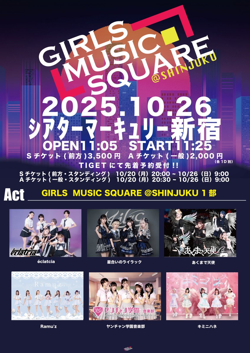音楽ライブ 2025年10月26日(日) ~ 2025年10月26日(日) GIRLS MUSIC SQUARE @新宿 1部 チケット購入: tiget.net イベント詳細 日付: 2025年10月26日 11:25 – 14:05 カテゴリ: 音楽ライブ 公演概要 開演日時 10月26日(日) 開場11:05/開演11:25/終演14:05 チケット ・Sチケット(前方):3,500円 ・Aチケット(一般):2,000円 チケットはこちらにて販売。 ※ご入場の際は、別途で1ドリンク(600円)のお支払いが必要となります。 出演者 ヤンチャン学園音楽部 / Ramu’z / 星合いのライラック / あくまで天使 / キミニハネ / éclatcia 主催 LIME-LIGHT お問い合わせ 公演に関するお問い合わせはこちらにお願いいたします。